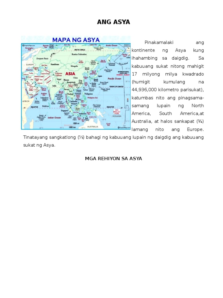 Ito ay may sukat ng 44 milyong square kilometro. Pagdating sa sukat ng sakop na lupain ang pinakamalaking kontinente sa daigdig ay ang asyasinasabi na ang asya ay sumasakop sa 1 3 o sangkatlong bahagi ng kalupaan sa buong mundo o may kabuuang sukat na 44614000 kilomtero kuwadrado. Gitnang Asya Silangang Asia Timog Asya Timog-Silangang Asya kun saan naroroon ang ating bansang Pilipinas at Kanlurang Asya.