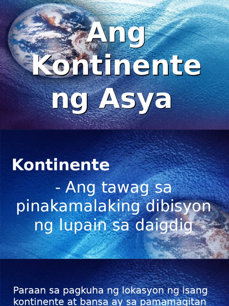 Ang asya ang pinakamalaking kontinente sa buong daigdig. Tingnan ang naisagawa nila noong 2013. Karagatang Pasipiko ang naghihiwalay sa mga kontinente ng Amerika Asya at Australia at nasa pagitan ito ng Southern Ocean Asia at Australia at ng Western Hemisphere.