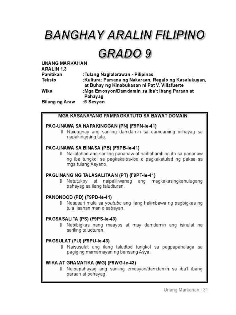 Salitang ginamit sa tanka at haiku PAGLINANG NG TALASALITAAN F9PT-IIa-b-45 Nasusuri ang tono ng pagbigkas ng napakinggang tanka at haiku PAG-UNAWA SA NAPAKINGGAN F9PN-IIa-b-45 Nakasusulat ng sariling Tanka o Haiku bilang pagpapahalaga sa sariling damdamin at sa F9PU -IIa b 47 Nabibigkas ang isinulat na tanka at haiku nang. Ang mga akdang nasulat ni Rizal upang ipakita ang kaniyang pakikipaglaban sa mga Espanyol ay ang Noli Me Tangere at El Filibusterismo dahil sa mga akdang ito ay ginising ni Rizal ang damdaming makabayan ng mga Pilipino Nakapaloob. 9 Panitikang Asyano Modyul ng Mag-aaral sa Filipino ARALIN 2 Mga Akdang Pampanitikan ng Silangang Asya Ang aklat na ito ay magkatuwang na inihanda at sinuri ng mga edukador mula sa mga publiko at pribadong paaralan kolehiyo at o unibersidad.